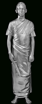 The real strangeness of “School Play” resides in the grown boy’s steely expression. He has always been inscrutable, but now he meets our gaze. Is his cold stare a projected “attitude or role” as Ray suggests? If his face has become a mask, then what can be read behind the eyes? I imagine he is starring in a school production of “Julius Caesar.” His ready sword hints he has been cast as Brutus — “Et tu, Brute?”– who murderously betrays trusting Caesar and so (with the best, most idealistic intentions) ignites civil war, ends free republican rule, and ruins Rome. Can all this be discerned in our boy’s deadpan expression? Maybe. I don’t know, but as I back up for a better vantage to admire this elegant sculpture of a young American man, I recall the lyrics of Rush’s classic ballad: “A modern day warrior/ Mean, mean stride/ Today’s Tom Sawyer/ Mean, mean pride.”