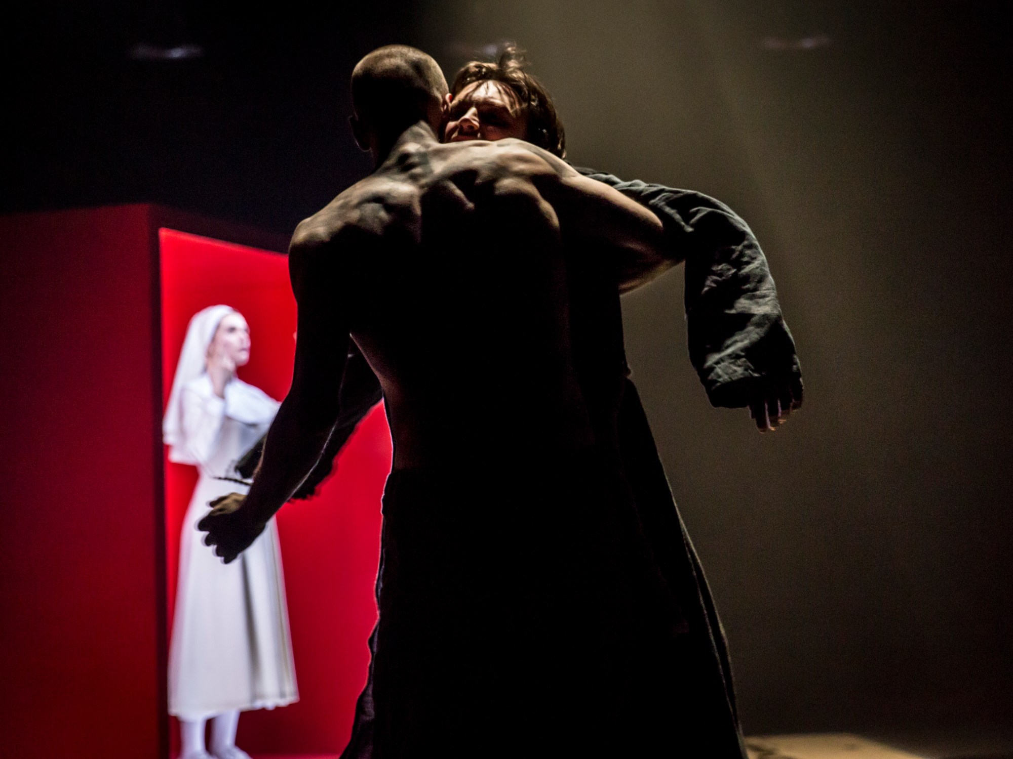 It is here that this extraordinary production exposes this problem play’s madly beating heart. Stymying the Duke’s manipulations and digressing from its own fast-flowing narration, Barnardine and the Duke embrace and begin to waltz. They spin across the stage and, as the music takes on a manic edge, the great red cubes upstage rotate to reveal neon-lit tableau, a triptych. Here is the condemned fornicator Claudio strapped into an electric chair. There is the brutal pimp, Pompey vigorously raping one of his whores. In the middle is Isabella the tempting virgin, her palms extended in recollection of the crucifixion. It is Christ, once again, between the criminals. Is dancing Barnardine another Barabas, and the Duke, another Pilate? What’s the meaning of this waltz?